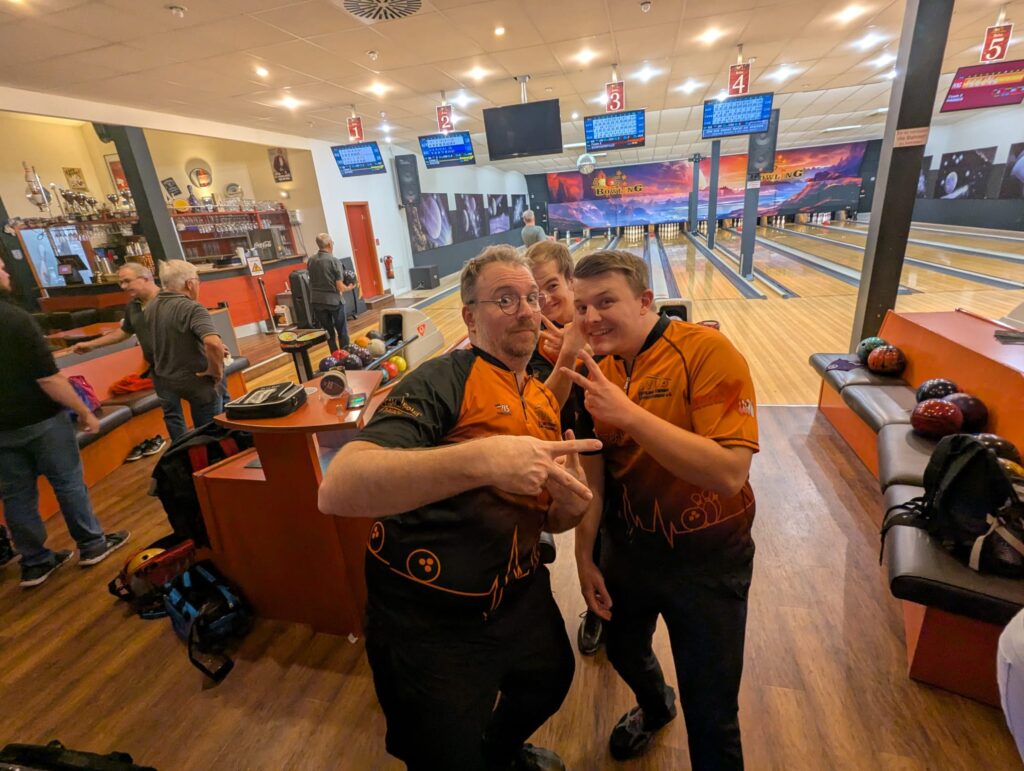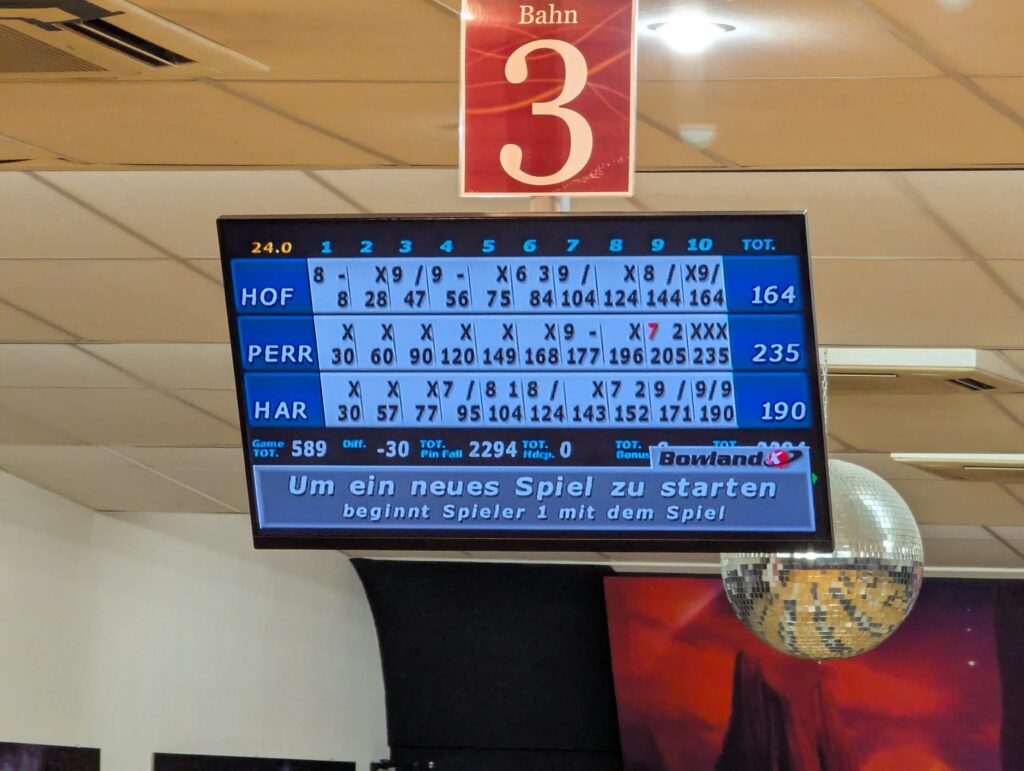 Spiel 4. Mit einer 180 Pins Vorsprung, fühlen wir uns schon recht sicher, aber Olching glaubt noch an das Wunder! Was bei Ihnen im Spiel davor alles schiefging, klappte nun und die Strikes flogen uns um die Ohren. Mit 215, 201 und 203 spielen sie die höchste Serie des Tages gegen uns (619). Und unsere Antwort? Tobi verschießt leider zu häufig einzelne Pins oder leichte Spares, weshalb er leider nicht den 200er Schnitt schafft auf die 4 Spiele und Beni beginnt mit 3 Strikes und kann dann auch nur noch Spares machen, aber eben nicht alle. Clément hingegen hat bis zum 6. Frame gestrikt und hat somit spielübergreifend 14 Strikes in Folge (!!) gehabt. Wahnsinn! Leider hat er aber dann noch 2 Spares verschossen und aber dazwischen dann munter weiter gestriket. Das rettet unser Teamergebnis mit seinen 235 auf 589. Endergebnis (schon wieder) 2:2 mit 2294:2144 Pins für uns.
